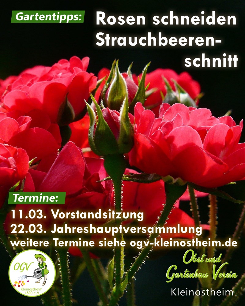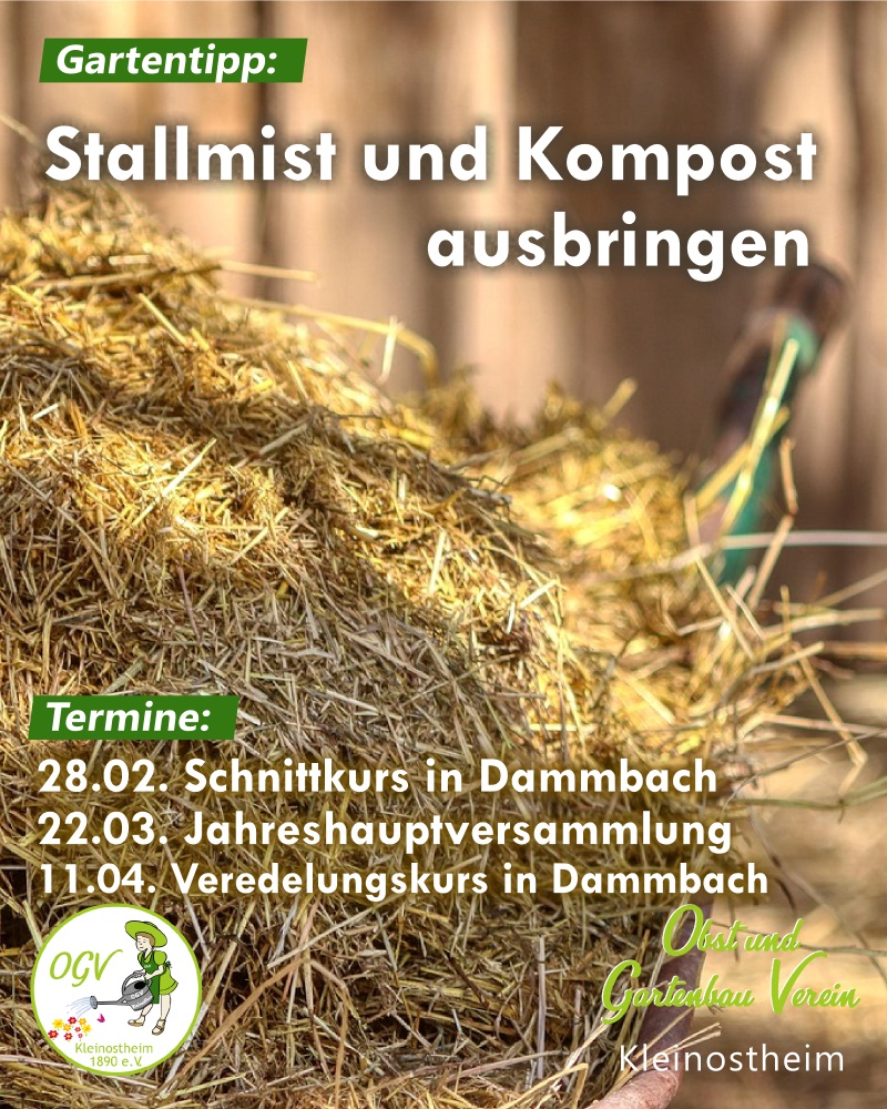 Langsam wirkende organische Dünger wie gut abgelagerter Stallmist und Kompost können Sie jetzt bereits ausbringen, da sie kaum schnell löslichen Stickstoff enthalten und damit die Gefahr der Auswaschung gering ist. Jahreshauptversammlung am Sonntag 22. März 2026 Beginn: 15.00 Uhr Ort: Vereinsheim, Ahornweg Tagesordnungspunkte Erziehungs- und Pflanzschnitt an jungen Obstbäumen aus dem Streuobstpaktin Theorie und Praxis Am Samstag 28.02.2026 um 13.00 Uhr (Veranstalter Kreisverband für Gartenbau)Treffpunkt: Vereinsheim OGV Dammbach, Langenrain 6, Dammbachanschließend Gang zur Obstwiese zum praktischen Teil(Teilnahme kostenlos, ohne Anmeldung auch für Nichtmitglieder) Veredelungskurs ganztägig in Theorie und Praxis Am Samstag, 11.04.2026 ab 10.00 Uhr (Veranstalter Kreisverband für Gartenbau)Vereinsheim des OGV Dammbach, Langenrain 6, Dammbach(mit Anmeldung) Anmeldeformulare im Internet www.kv-gartenbauvereine-ab.de…