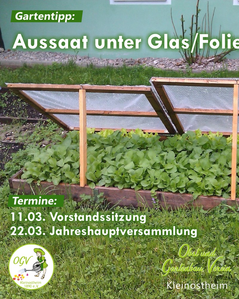 Unter Glas oder Folie (z.B. in Frühbeete) können nun folgende Gemüsearten ausgesät werden: Kohlrabi, Pflücksalat, Saatzwiebeln, Schnittsalat, Sommerlauch und Weißkohl. Jahreshauptversammlung Unsere diesjährige Jahreshauptversammlung findet am Sonntag 22. März 2026 um 15.00 Uhr am Vereinsheim, Ahornweg, statt. Die Tagesordnung finden Sie im Terminkalender. Vorstandssitzung Am Mittwoch, 11.03.2026, findet um 19.00 Uhr eine Vorstandssitzung im Vereinsheim statt.