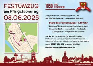 Treffpunkt ist am Sonntag, 8.6.2025 um 11.00 Uhr am Rathaus Kleinostheim. Wir werden unter der Zugnummer 18 am Festzug teilnehmen. Der Verein stellt Schürzen mit dem Vereinsemblem zur Verfügung. Diese werden nach dem Festzug wieder eingesammelt.