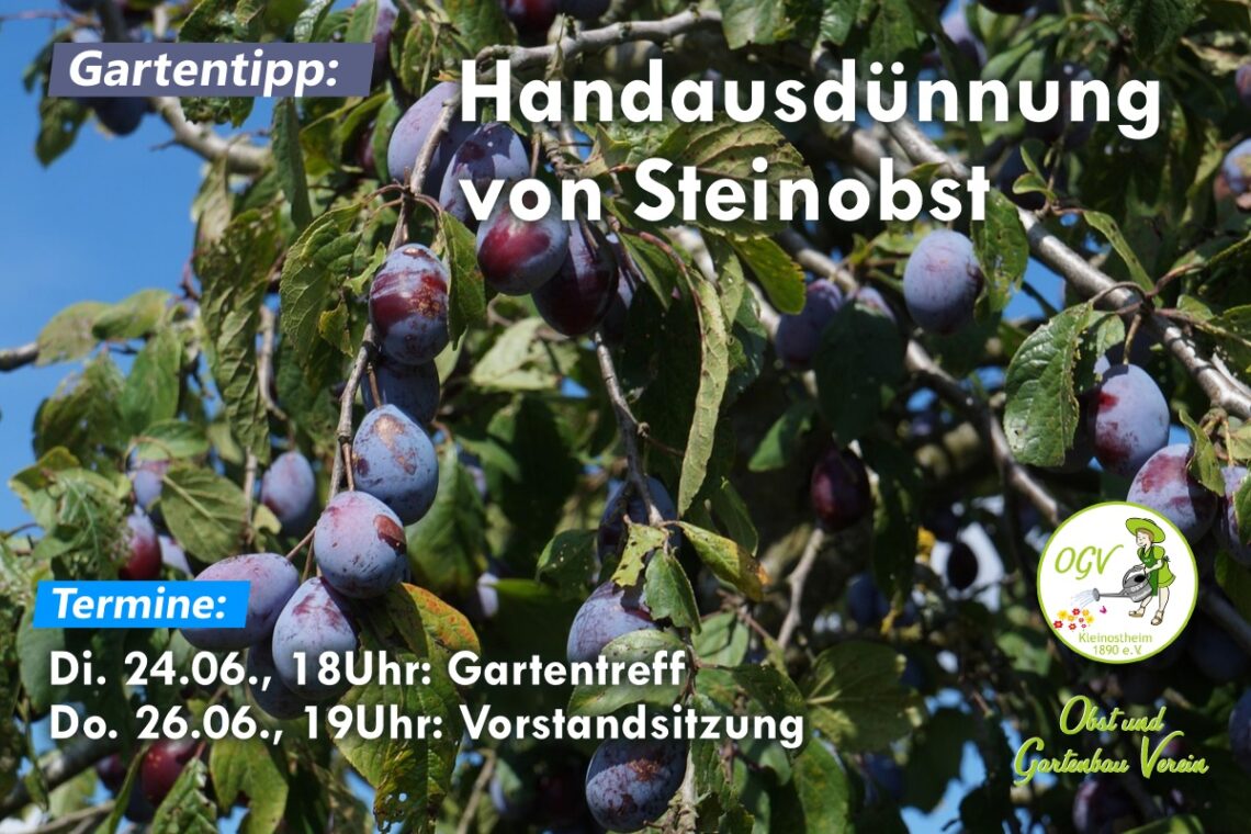 Hierbei können folgende Fruchtzahlen angestrebt werden:Pfirsiche: faustbreiter Abstand zwischen den Früchten notwendig, da sonst kurz vor der Ernte ein Abdrücken der Früchte droht. Zwetschgen: max. 20 Früchte pro lfm Fruchtholz. Termine: Gartentreff: Am Dienstag, 24.06.2025 findet um 18.00 Uhr unser Gartentreff am Vereinsheim statt. Vorstandssitzung: Die nächste Vorstandssitzung ist am Donnerstag, 26.06.2025 um 19.00 Uhr im Vereinsheim.