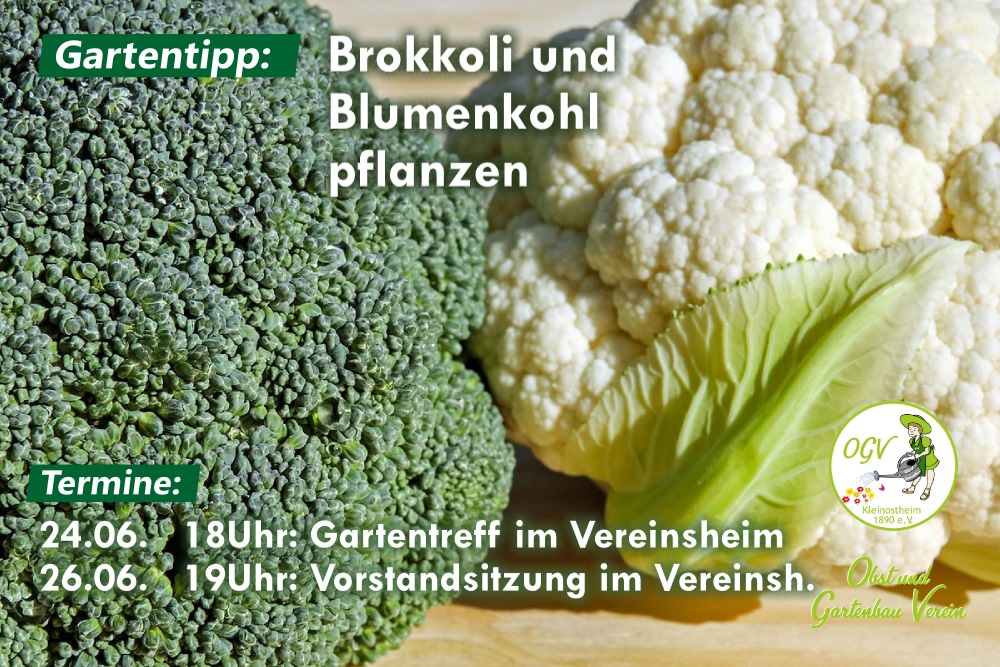 Für eine Ernte Mitte August kann man bis Mitte Juni noch Brokkoli und Blumenkohl pflanzen. Damit die Blumenkohlrosen gegen Sonne und andere Witterungseinflüsse geschützt sind, sollte man die äußeren Blattspitzen zusammenbinden, sobald sich der Ansatz der Blumen zeigt. Außerdem kann man die äußeren Blätter leicht knicken und somit etwas Schatten spenden. Gartentreff:Am Dienstag, 24.06.2025 findet um 18.00 Uhr unser Gartentreff am Vereinsheim statt. Vorstandssitzung:Die nächste Vorstandssitzung ist am Donnerstag, 26.06.2025 um 19.00 Uhr im Vereinsheim.